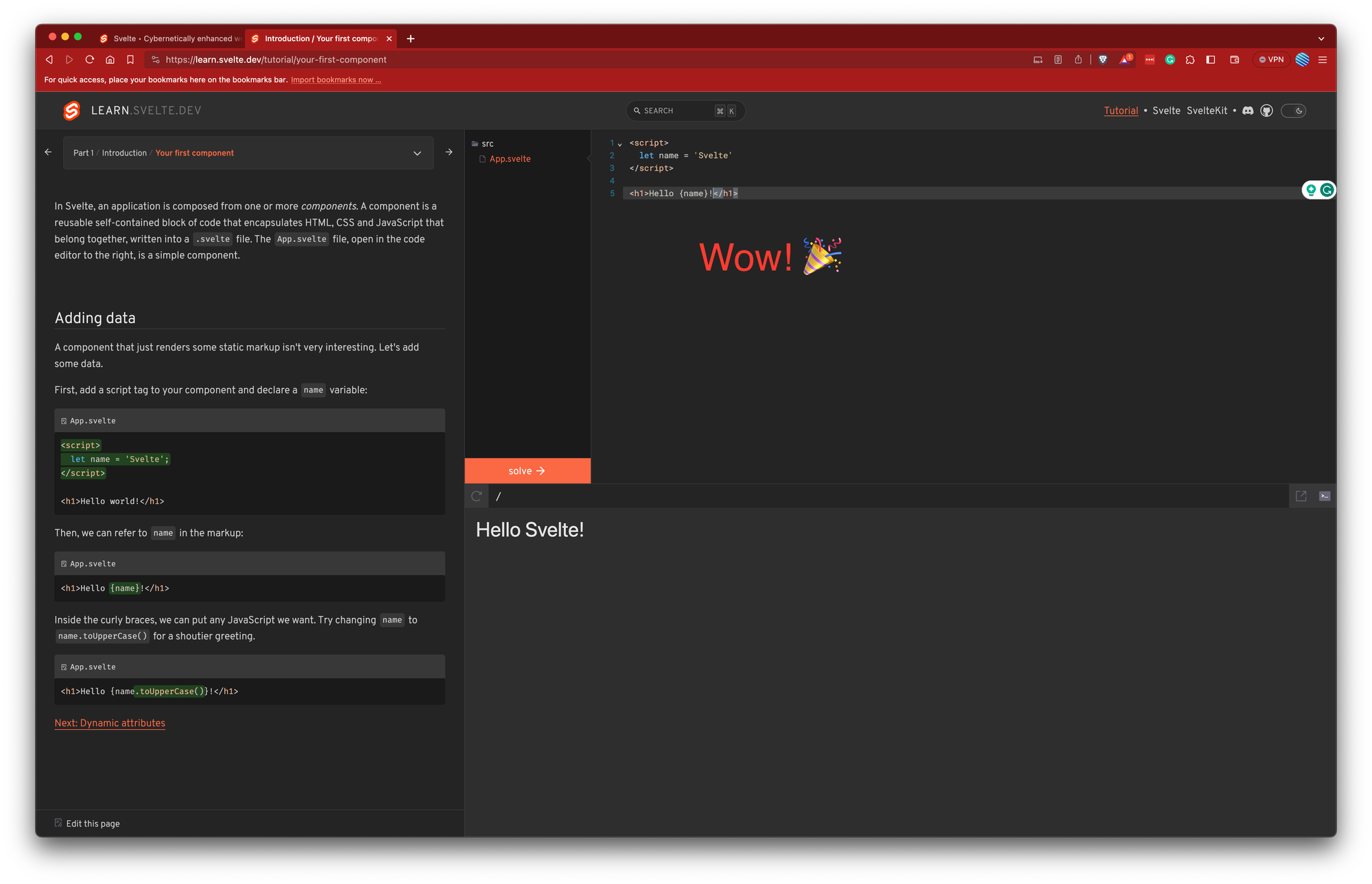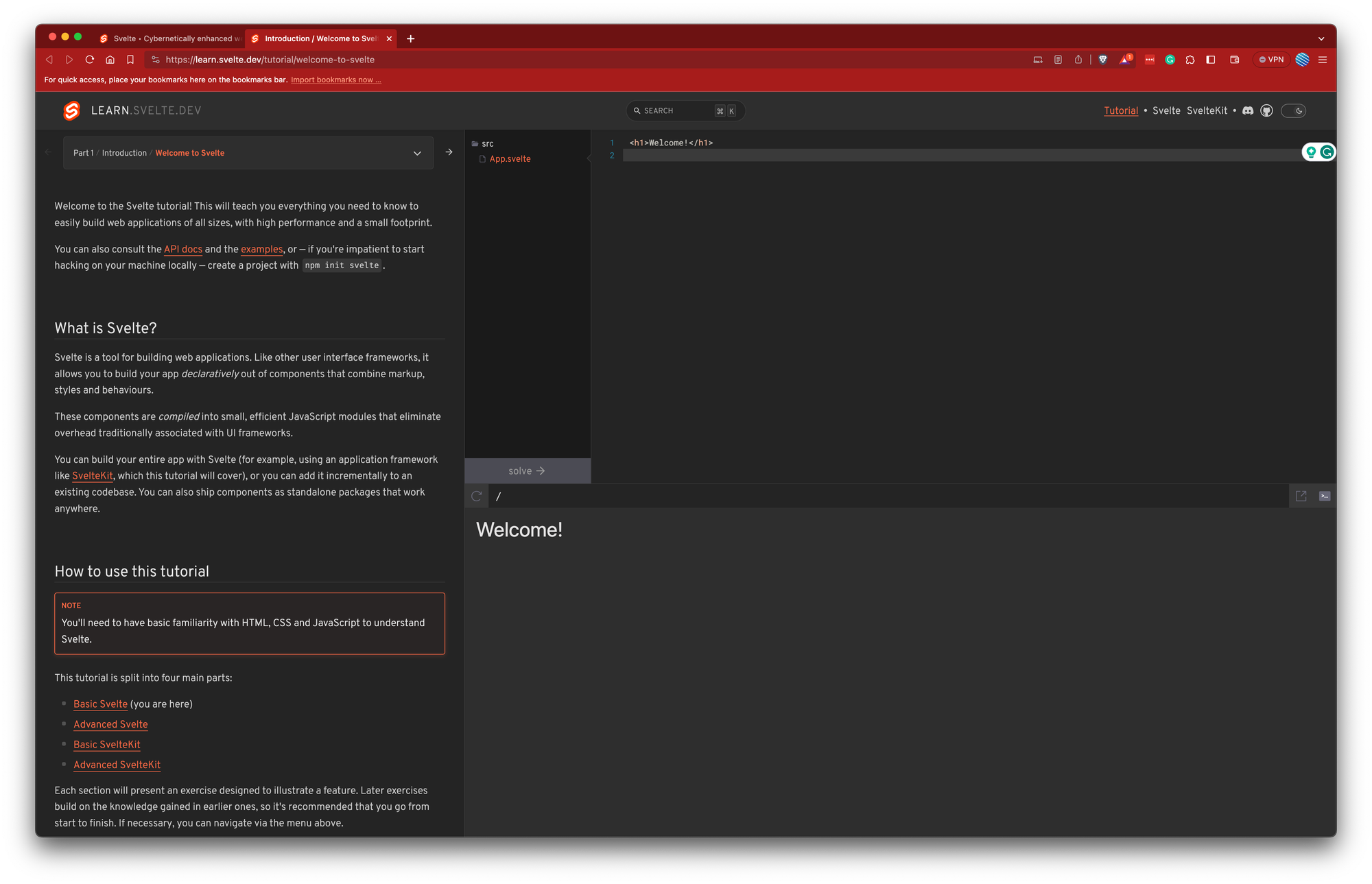 The decision to delve into Svelte began an exciting new chapter. My first step was to visit the Svelte website, a gateway to understanding this new framework. What immediately stood out was the interactive tutorial—a clever and engaging way to introduce the core concepts. This hands-on approach felt both refreshing and effective, allowing me to immerse myself in Svelte's world in a practical, interactive manner.