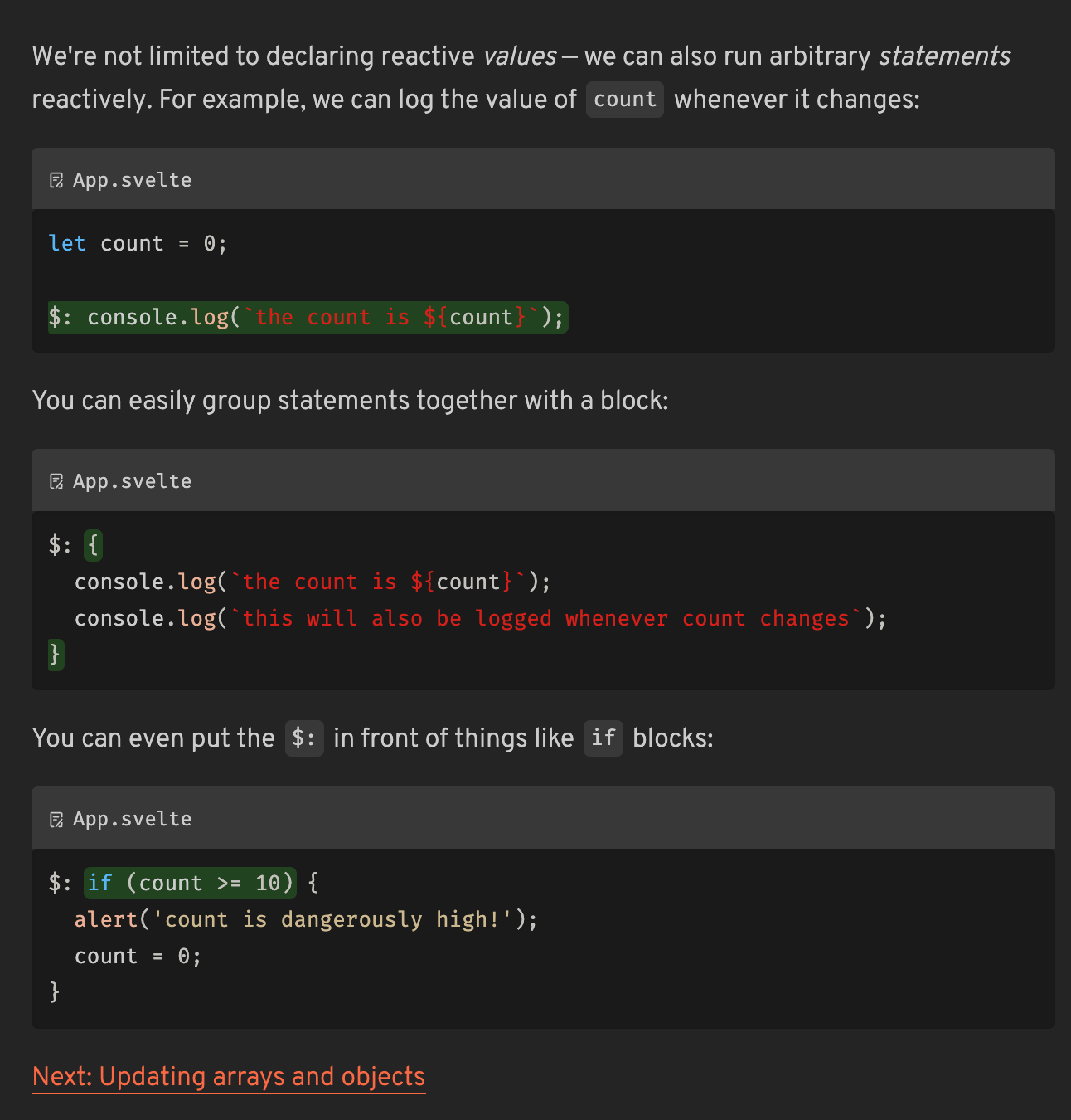The tutorial then introduced me to the heart of Svelte—Reactivity. Assigning functions to event handlers on HTML elements was just the beginning. Svelte's approach to reactivity, especially with its reactive declarations and statements, was a revelation. These features allow for an automatic re-run of code whenever the bound data changes, presenting a more straightforward and less verbose way of handling data updates compared to what I was accustomed to in React, whereby we'd get similar behaviour using the useEffect hook with an array of dependencies.