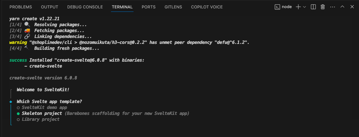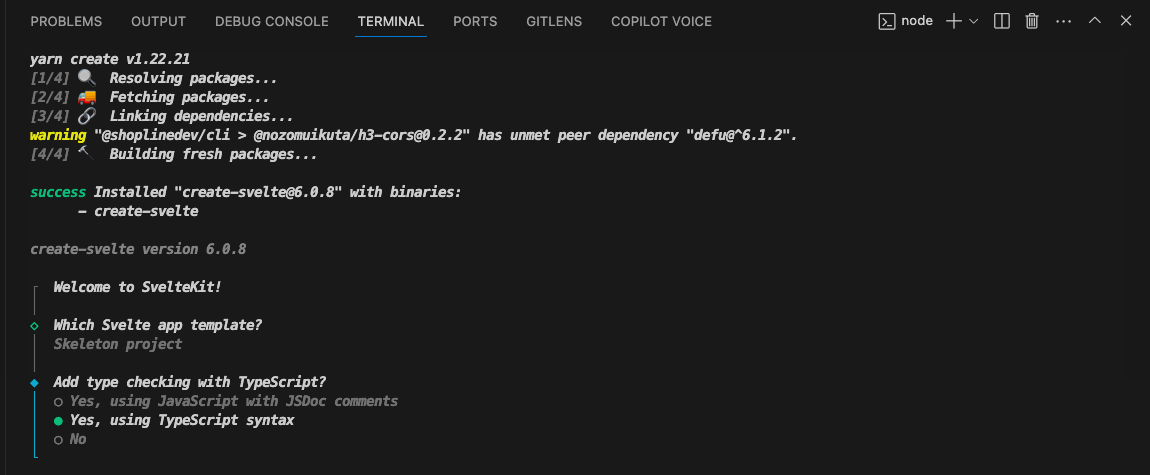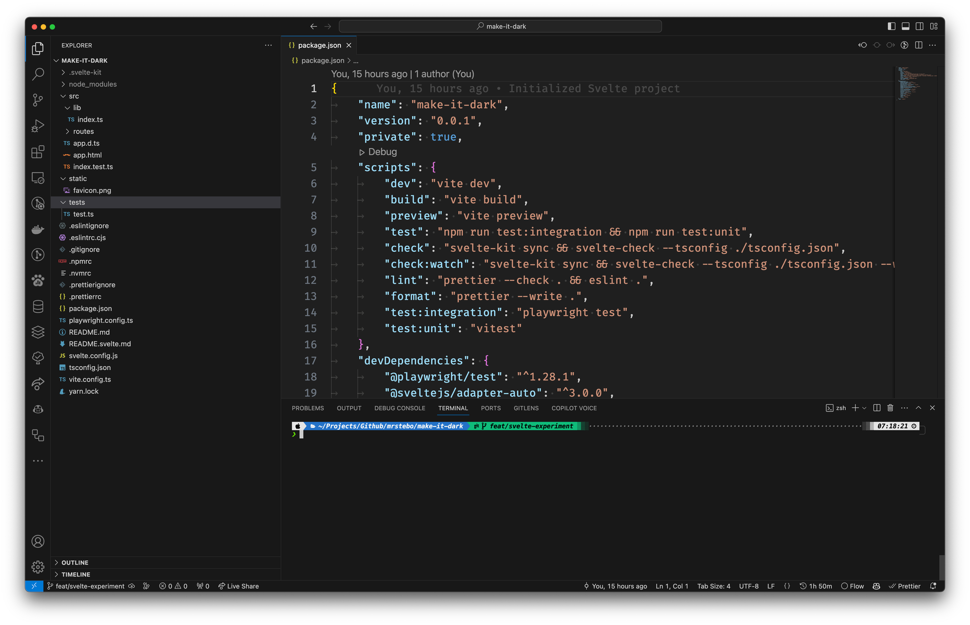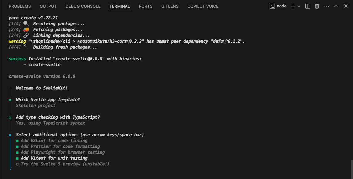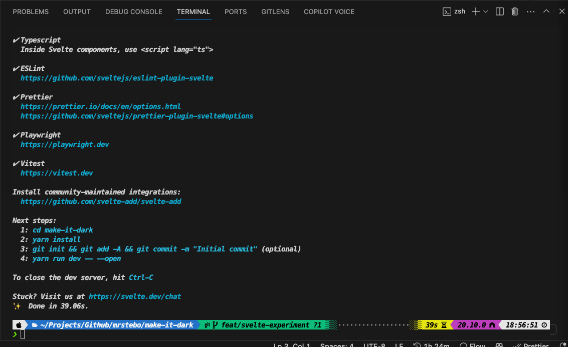 With the repository cloned, I opened the project in Visual Studio Code (VSCode), my editor of choice, for its robust features and seamless integration with various development tools. The next step was to initialize the Svelte project. From the integrated terminal in VSCode, I ran the command yarn create svelte make-it-dark. This command set the gears in motion, leading me through a series of options and configurations for the project. Notably, I chose to use TypeScript for this project, aligning with my preference for strong typing and its benefits in maintaining code quality.