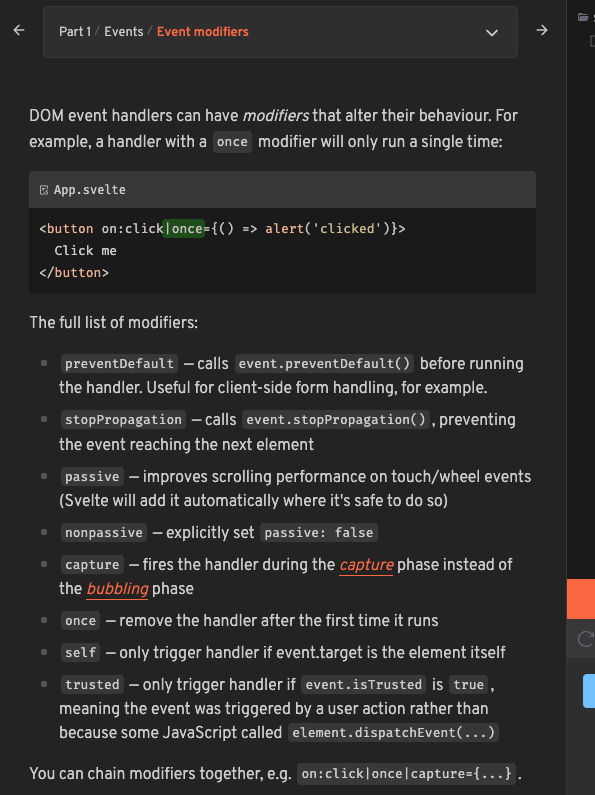 Lastly, the concept of Event Modifiers in Svelte was intriguing. Attaching modifiers like once to event handlers, as demonstrated in the tutorial, allows for modifying the behaviour of events in a concise manner. For instance, on:click|once could be used to ensure that a click event handler runs only once, automatically detaching itself after the first execution. It's these little nuances that make Svelte an exciting framework to explore.