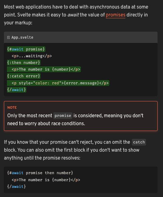 Svelte's syntax for conditional and each blocks had a familiar feel, reminiscent of Handlebars. This similarity provided a sense of comfort, yet Svelte introduced something new—await blocks. These blocks elegantly handle asynchronous operations, showcasing loading states in a more declarative way, a feature not commonly seen in other frameworks I've worked with.