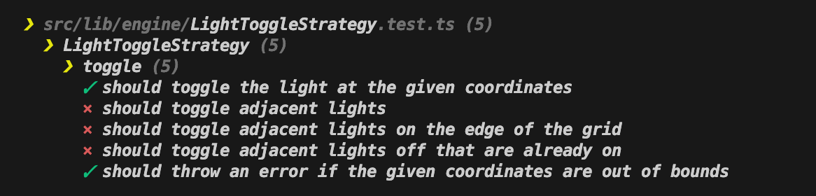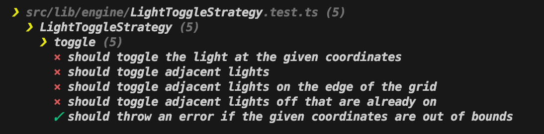 export class LightToggleStrategy {}The main functionality revolves around the toggle method. This method must toggle the state of the specified light. However, I will tackle the error conditions first: