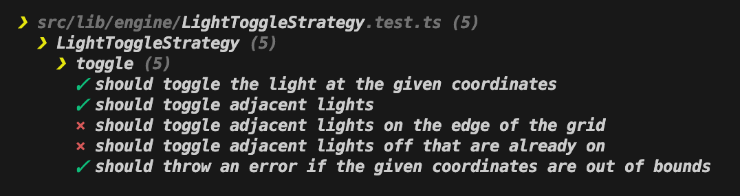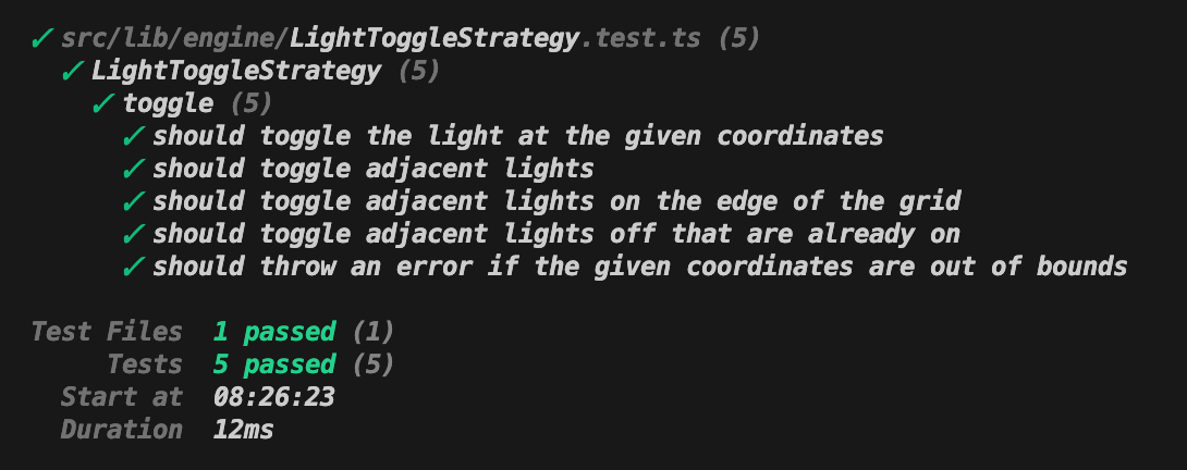 With the tests defined, the LightToggleStrategy class can be implemented to satisfy these requirements.