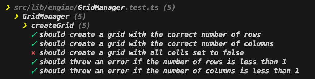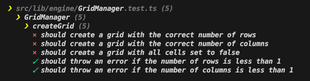 export class GridManager {}The first implementation step addresses the tests for invalid grid sizes. I start by adding a createGrid method that includes validation checks:
