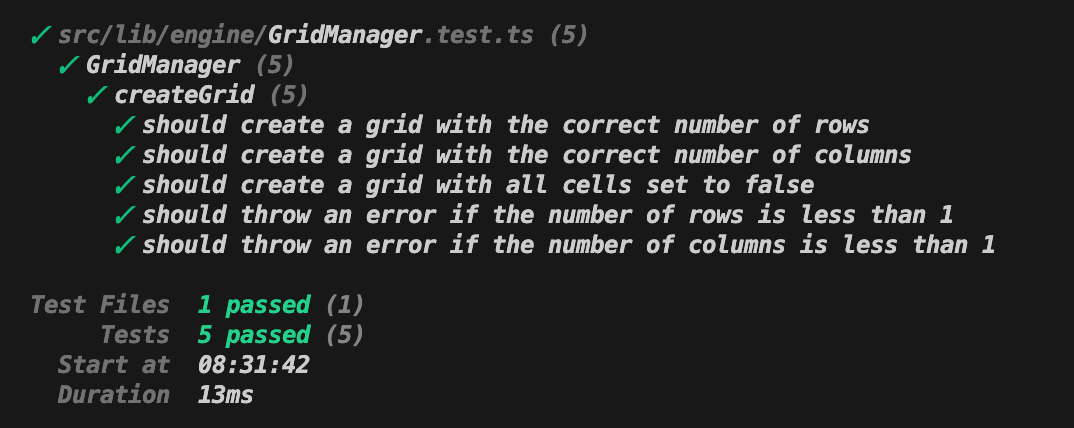 Through this step-by-step implementation, aligned with the TDD methodology, the GridManager evolves from a basic class into a functional component capable of generating and managing the game's grid.